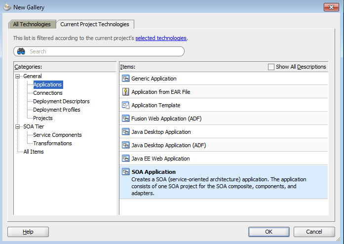 Open Jdeveloper and create a New Application by Navigating to File->New->Application->SOA Application. Click on Ok.